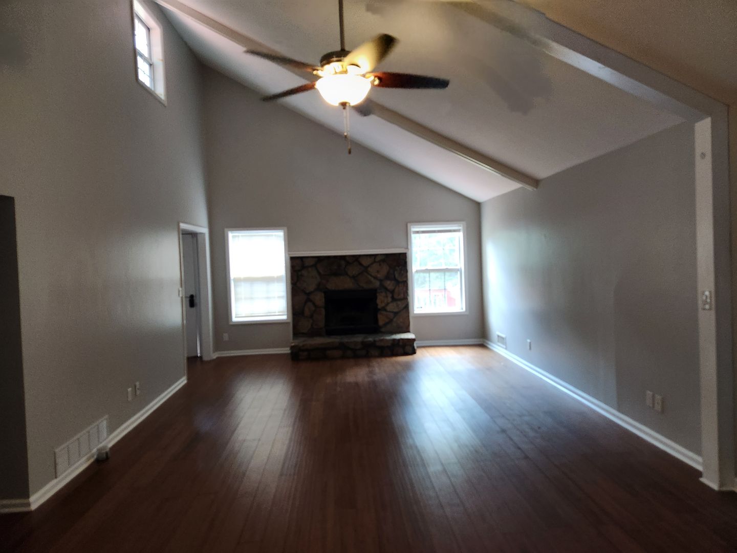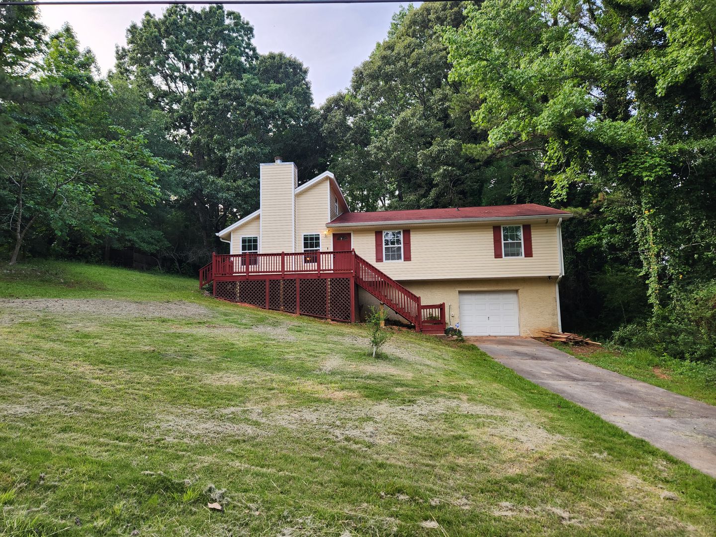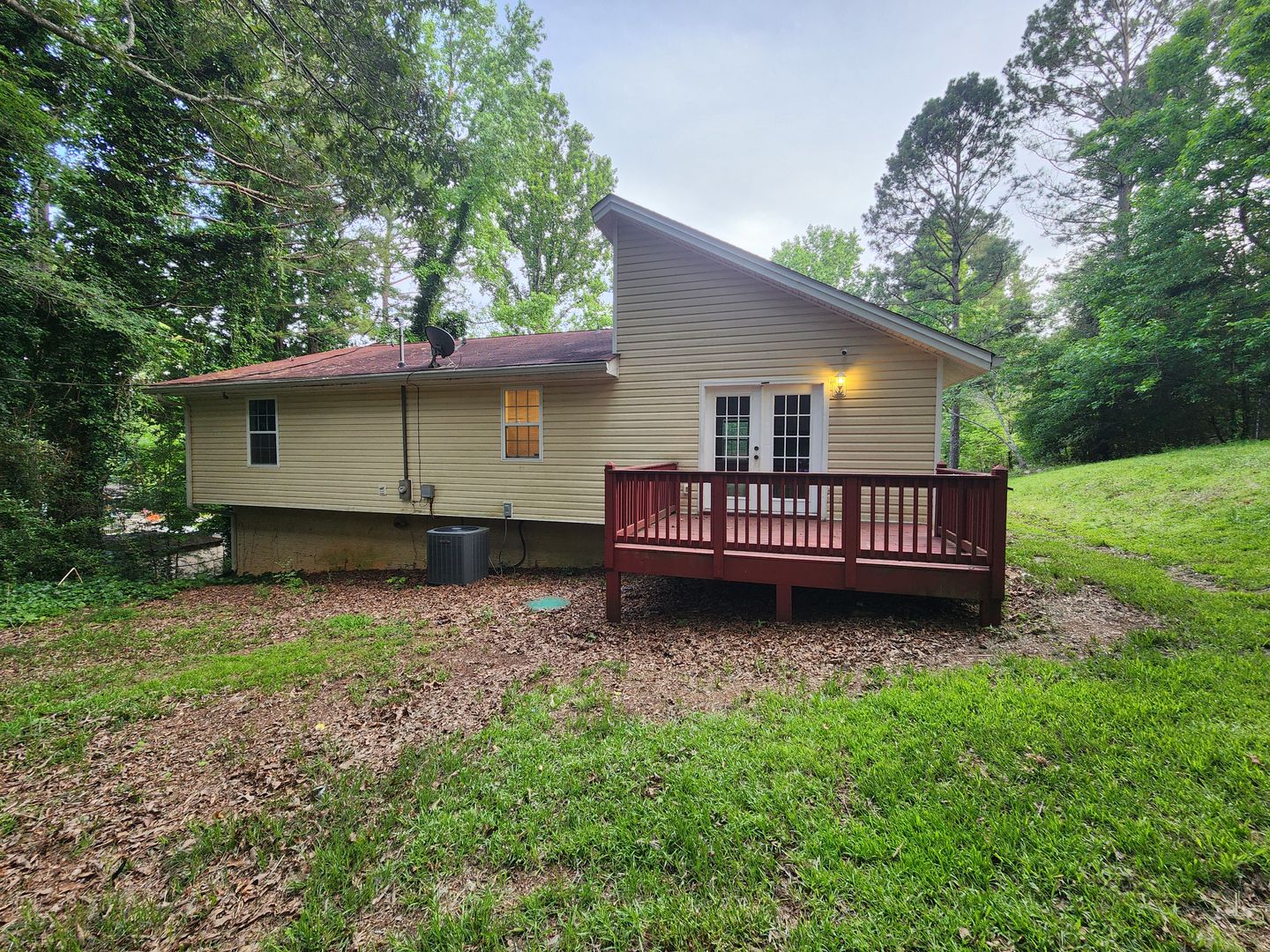 Welcome to your new home in Newnan, GA! This charming 3-bedroom, 2-bathroom house offers a cozy fireplace, vaulted ceilings, and beautiful wood floors throughout. The spacious eat-in kitchen is equipped with a dishwasher, microwave, and refrigerator, perfect for preparing meals and entertaining guests. Enjoy the serene wooded lot from your private deck, or relax in the living room with exposed beams adding character to the space. With a separate dining area and laundry room, this house has everything you need for comfortable living.3-bedroom 2-bath The basement will be covered into a studio apartment and will not be available for use.